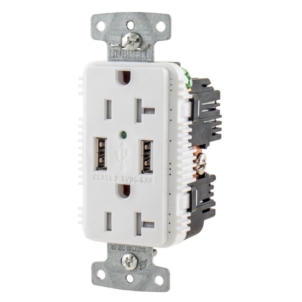 Wiring Device-Kellems tradeSELECT® USB20A5W Duplex Grounding Tamper Resistant Standard USB Charger Receptacle With Green LED, 20 A, 125 VAC, 2500 W, 1 Phase, 2 Poles, 3 Wires, White