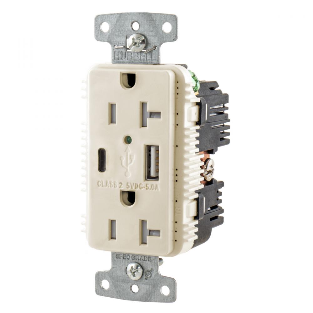 Wiring Device-Kellems tradeSELECT® USB20AC5LA Duplex Grounding Tamper Resistant Standard USB Charger Receptacle With Green LED, 20 A, 125 VAC, 2500 W, 1 Phase, 2 Poles, 3 Wires, Light Almond