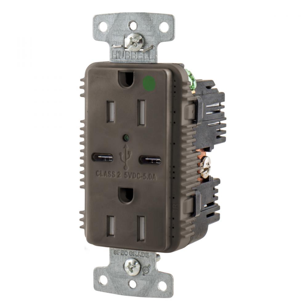 Wiring Device-Kellems USB8200C5 Duplex Grounding Tamper Resistant USB Charger Receptacle With Green LED, 15 A, 125 VAC, 0.5 hp, 2500 W, 1 Phase, 2 Poles, 3 Wires, Brown