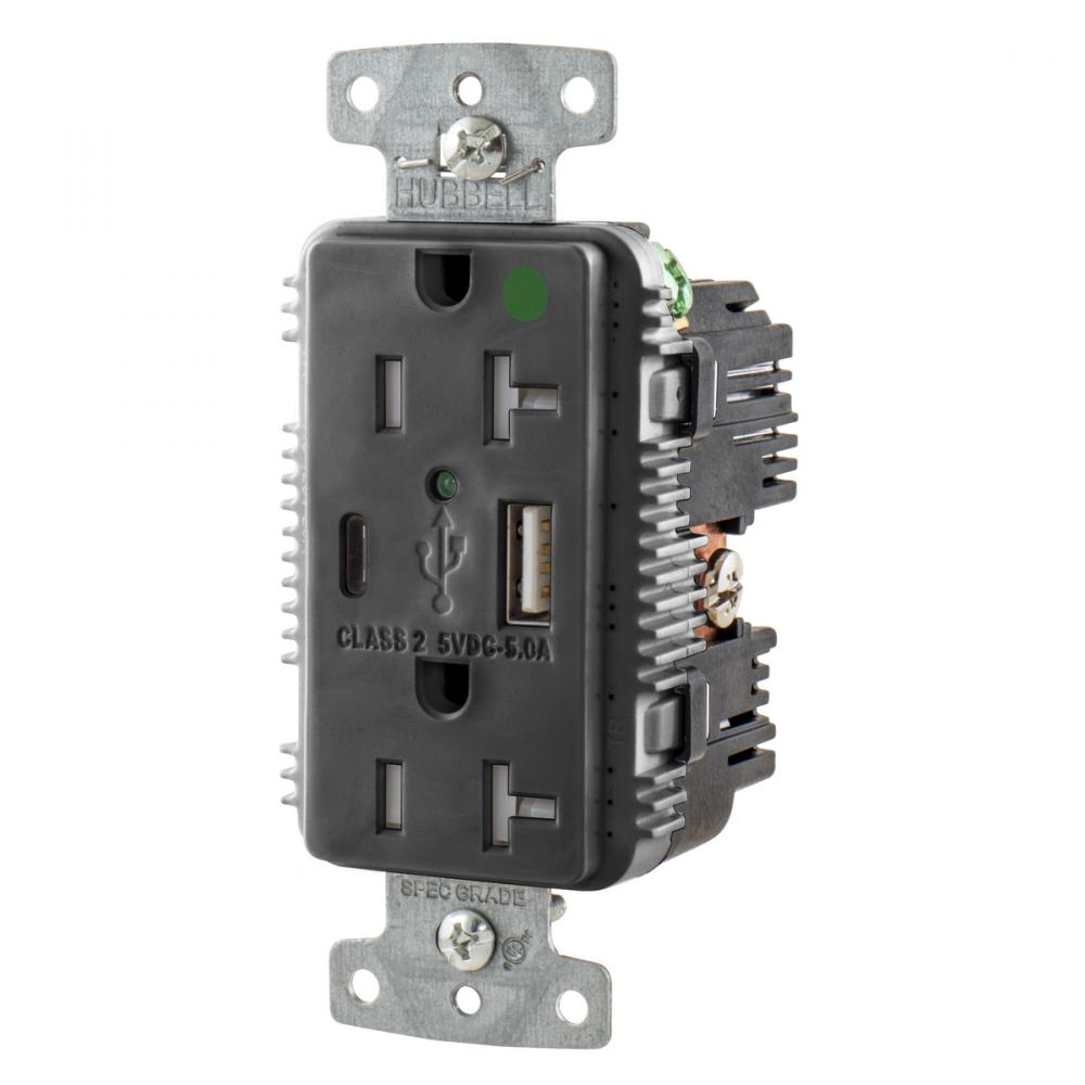 Wiring Device-Kellems USB8300AC5BK Duplex Grounding Tamper Resistant Standard USB Charger Receptacle With Green LED, 20 A, 125 VAC, 1 hp, 2500 W, 1 Phase, 2 Poles, 3 Wires, Black
