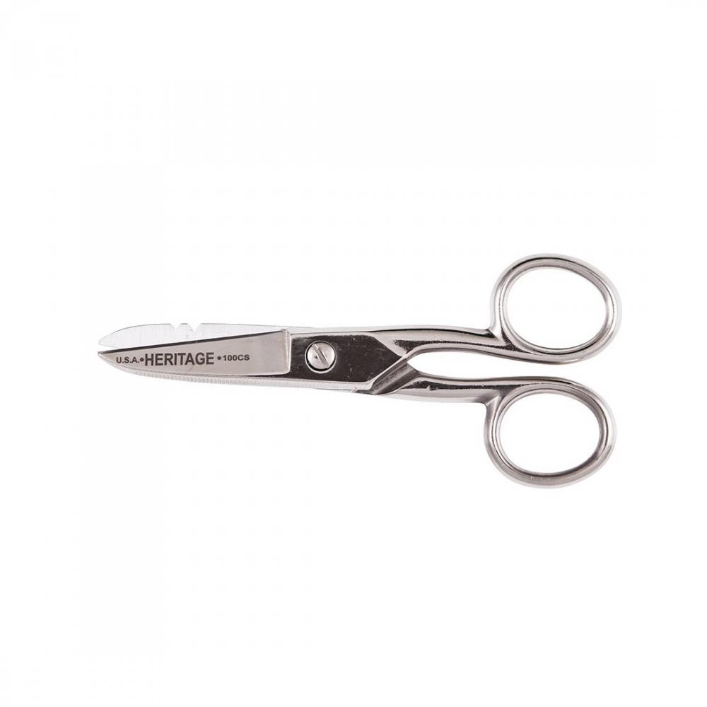 Klein® Heritage Cutlery™ 100CS Electrician Scissor, 1-7/8 in Length of Cut, 5-1/4 in OAL, Standard Tip, Serrated Edge, Carbon Steel Blade, Metal Handle, Right Hand