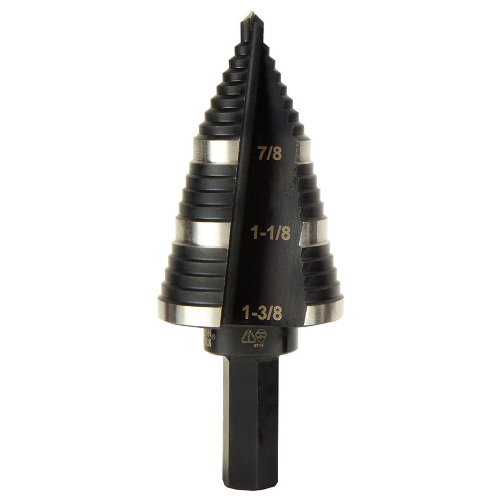 Klein® KTSB15 Step Drill Bit, Imperial, 7/8 in Min Hole Diameter, 1-3/8 in Max Hole Diameter, Steel, 3 Hole Sizes, 3/8 in Shank