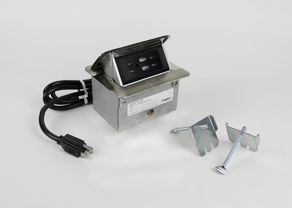 Wiremold® DEQUORUM DQFP15UST DE Quorum Single Flip-Up Unit With 6 in Cord and (2) USB Ports, Stainless Steel, 2 Outlets