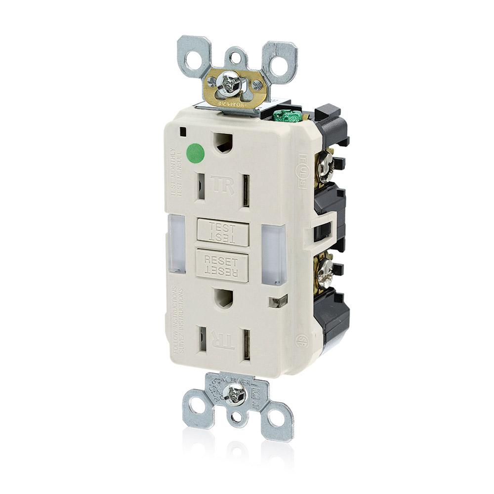 Leviton® SmartlockPro® Slim® GFNL1-HGT Duplex Feed Through Guidelight Self-Test Tamper Resistant GFCI Receptacle, 125 VAC, 15 A, 2 Poles, 3 Wires, Light Almond