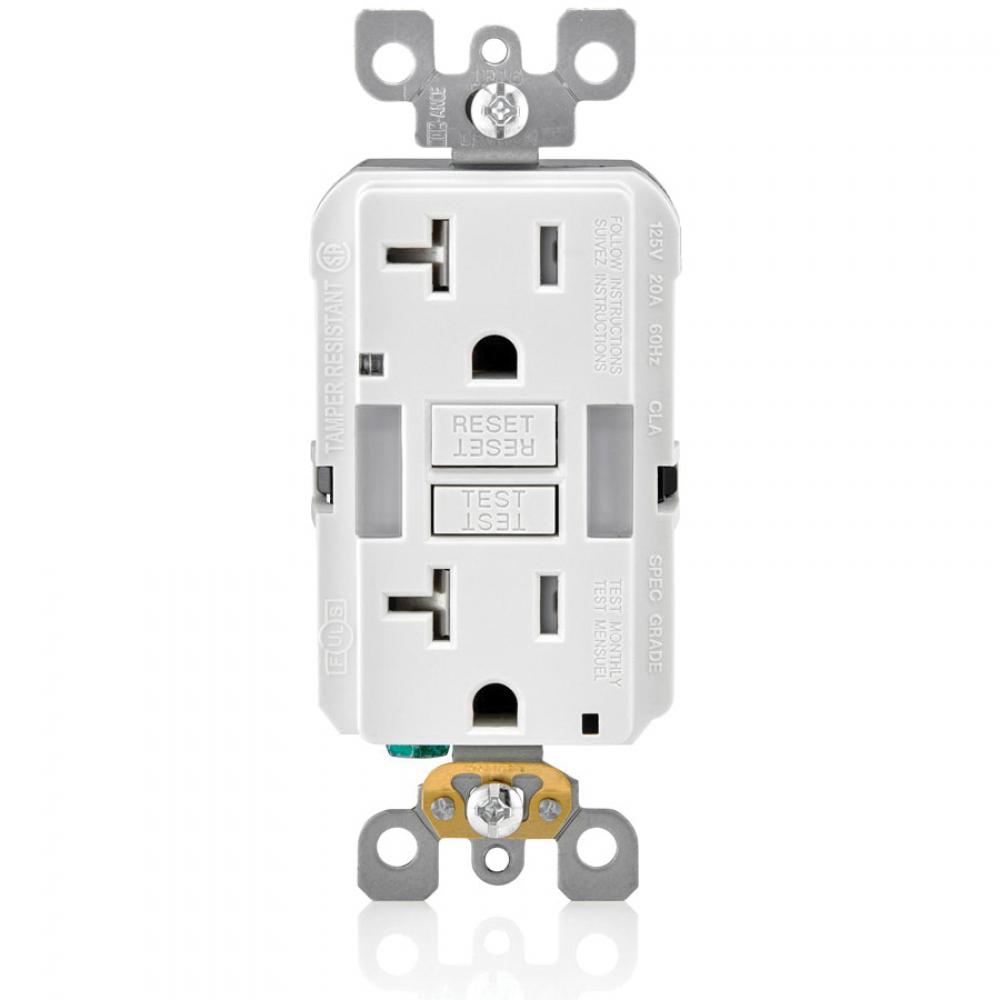 Leviton® SmartlockPro® Slim® GFNL2-W Duplex Feed Through Guidelight Monochromatic Self-Test Slim Tamper Resistant GFCI Receptacle With LED Indicator, 125 VAC, 20 A, 2 Poles, 3 Wires, White