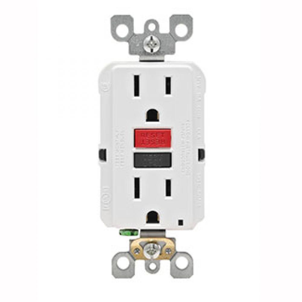 Leviton® Decora® GFNT1-RW Duplex Feed Through Monochromatic Self-Test Slim Standard GFCI Receptacle, 120 VAC, 15 A, 2 Poles, 3 Wires, White