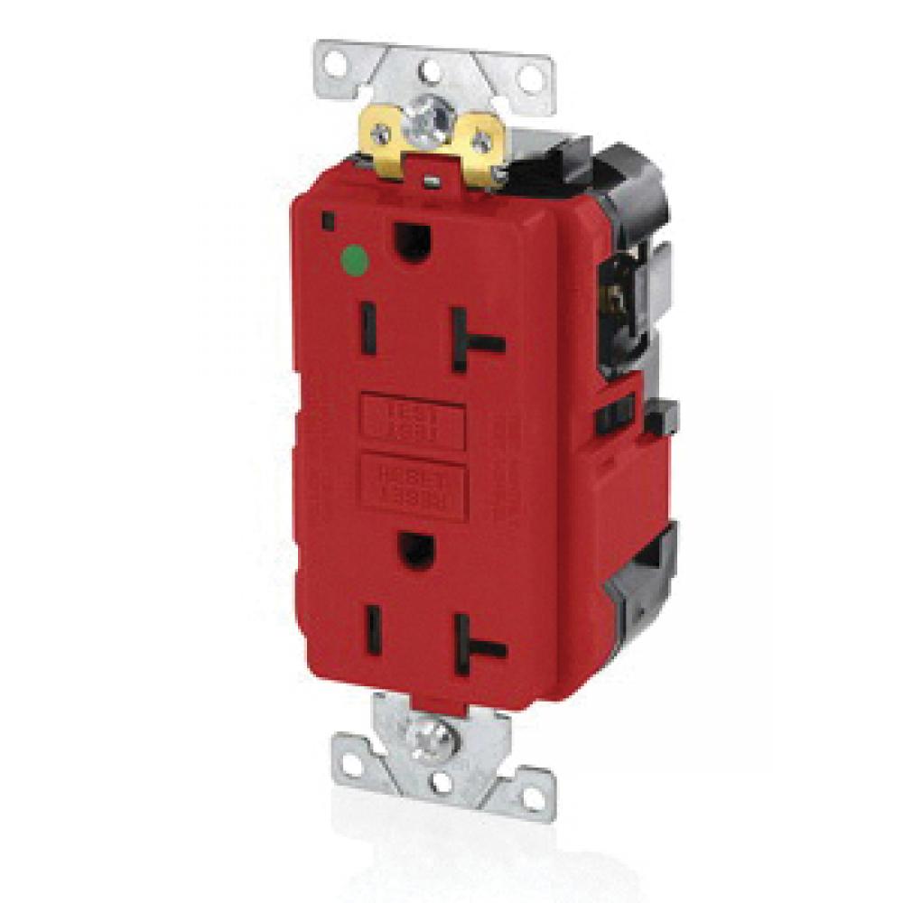 Leviton® SmartlockPro® Slim® MGFN2-HGR Duplex Feed Through Self-Test GFCI Receptacle, 125 VAC, 20 A, 2 Poles, 3 Wires, Red