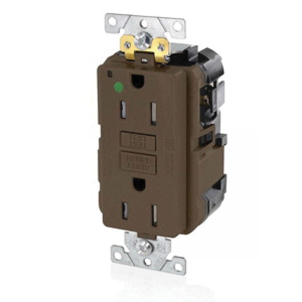 Leviton® SmartlockPro® Slim® MGFT1-HG Duplex Feed Through Self-Test Tamper Resistant GFCI Receptacle, 125 VAC, 15 A, 2 Poles, 3 Wires, Brown
