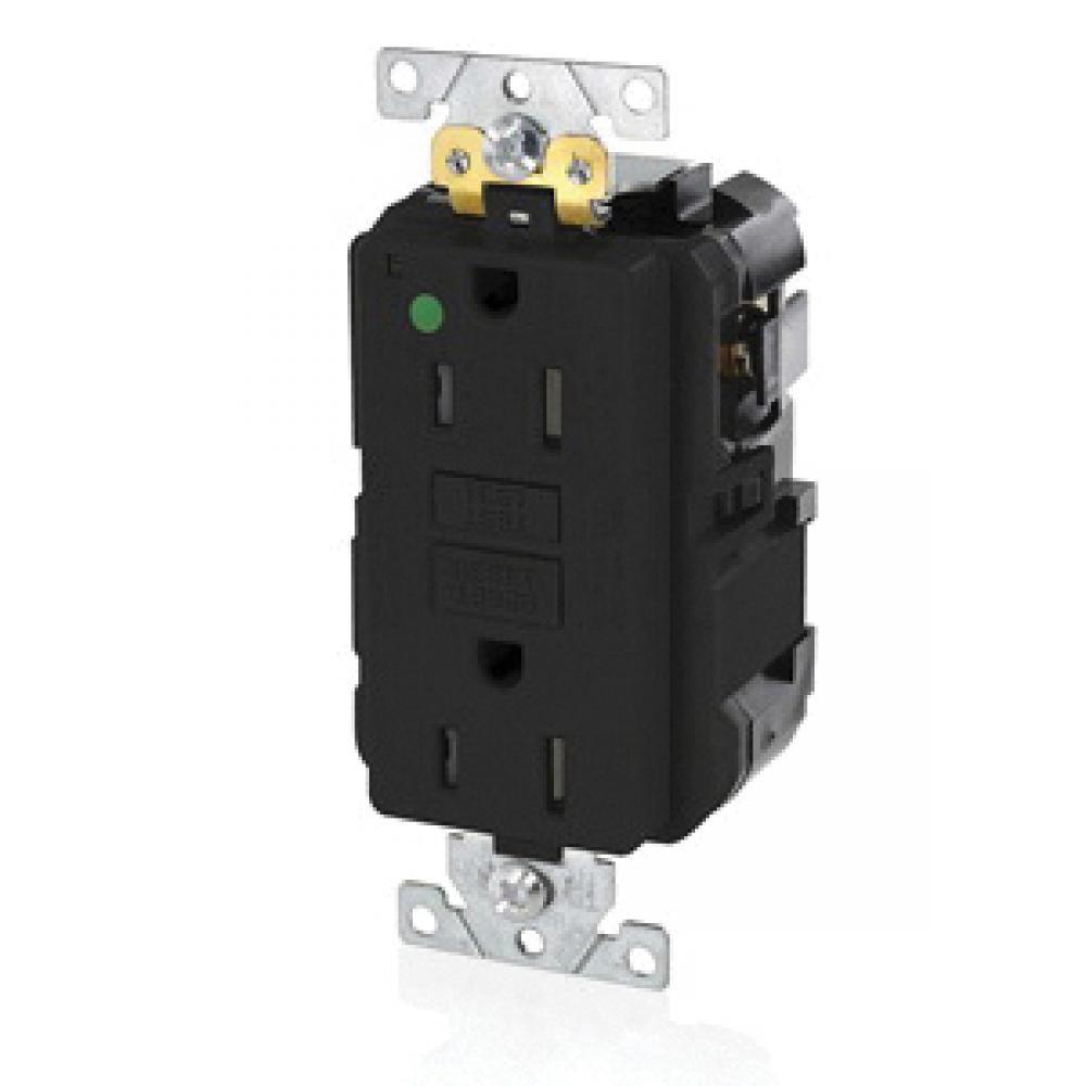 Leviton® SmartlockPro® Slim® MGFT1-HGE Duplex Feed Through Self-Test Tamper Resistant GFCI Receptacle, 125 VAC, 15 A, 2 Poles, 3 Wires, Black