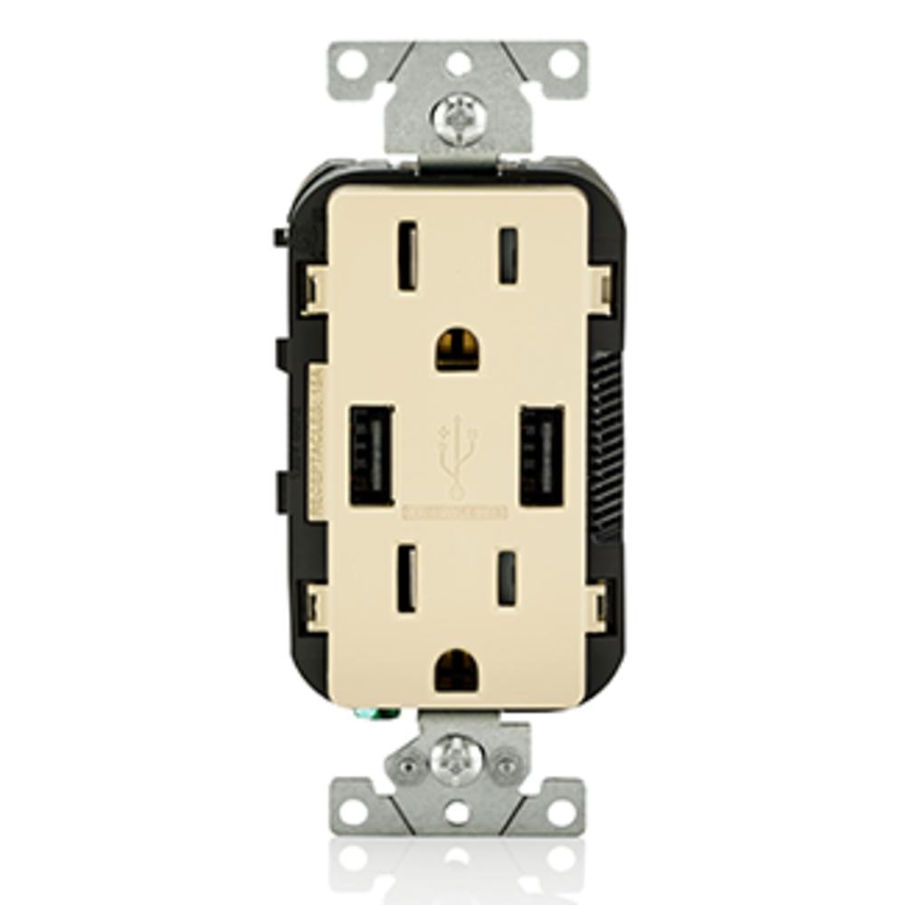 Leviton® T5632-I Grounding Tamper Resistant Receptacle and USB Charger, 15 A, 125 VAC, 0.5 hp, 2 Poles, 3 Wires, Ivory