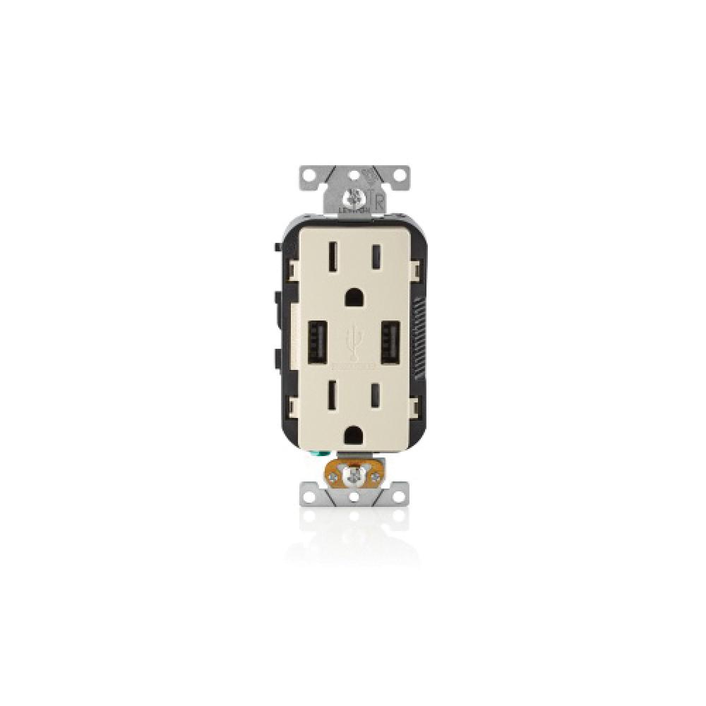 Leviton® Decora® T5632-ST Tamper Resistant Combination Duplex Receptacle/Outlet and USB Charger, 15 A/125 VAC/0.5 hp, 2 Poles, 3 Wires, Light Almond
