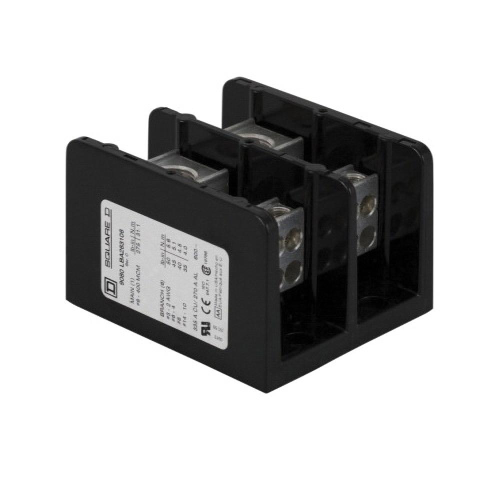 Square D™ 9080LBA264108 Multi Pole Distribution Block, 600 VAC/VDC, 270/335 A, 2 Poles, 4 AWG to 600 kcmil, 14 to 2 AWG Wire, Phenolic