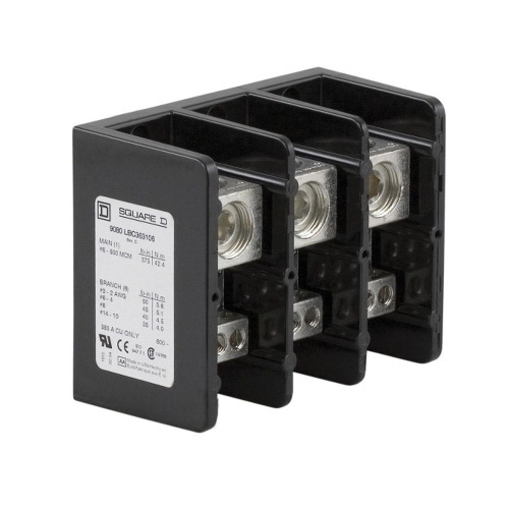 Square D™ 9080LBC363106 Multi Pole Distribution Block, 600 VAC/VDC, 380 A, 3 Poles, 4 AWG to 500 kcmil, 14 to 2 AWG Wire, Phenolic