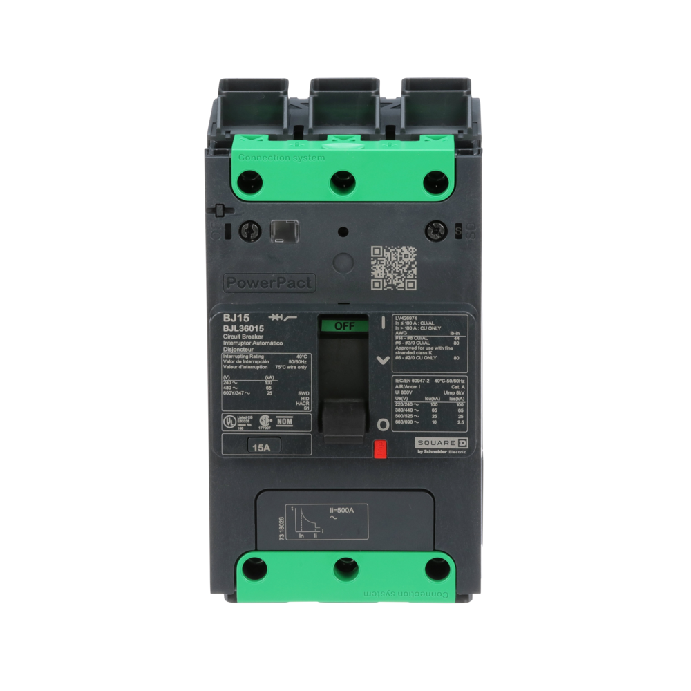 Square D™ PowerPact® EverLink BJL36015 Molded Case Circuit Breaker, 600Y/347 VAC, 15 A, 100 kA at 240 VAC, 65 kA at 480 VAC, 25 kA at 600Y/347 VAC Interrupt, 3 Poles, Thermal/Magnetic Trip