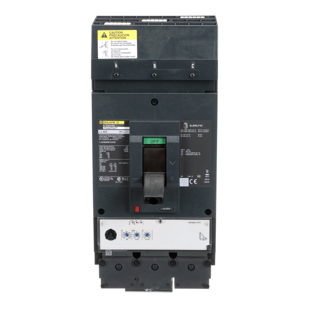 Square D™ I-Line™ PowerPact™ LJA36400CU33X Standard Molded Case Circuit Breaker, 600 VAC, 400 A, 100 kA at 240 VAC/65 kA at 480 VAC/25 kA at 600 VAC Interrupt, 3 Poles, Electronic Micrologic LSI Trip