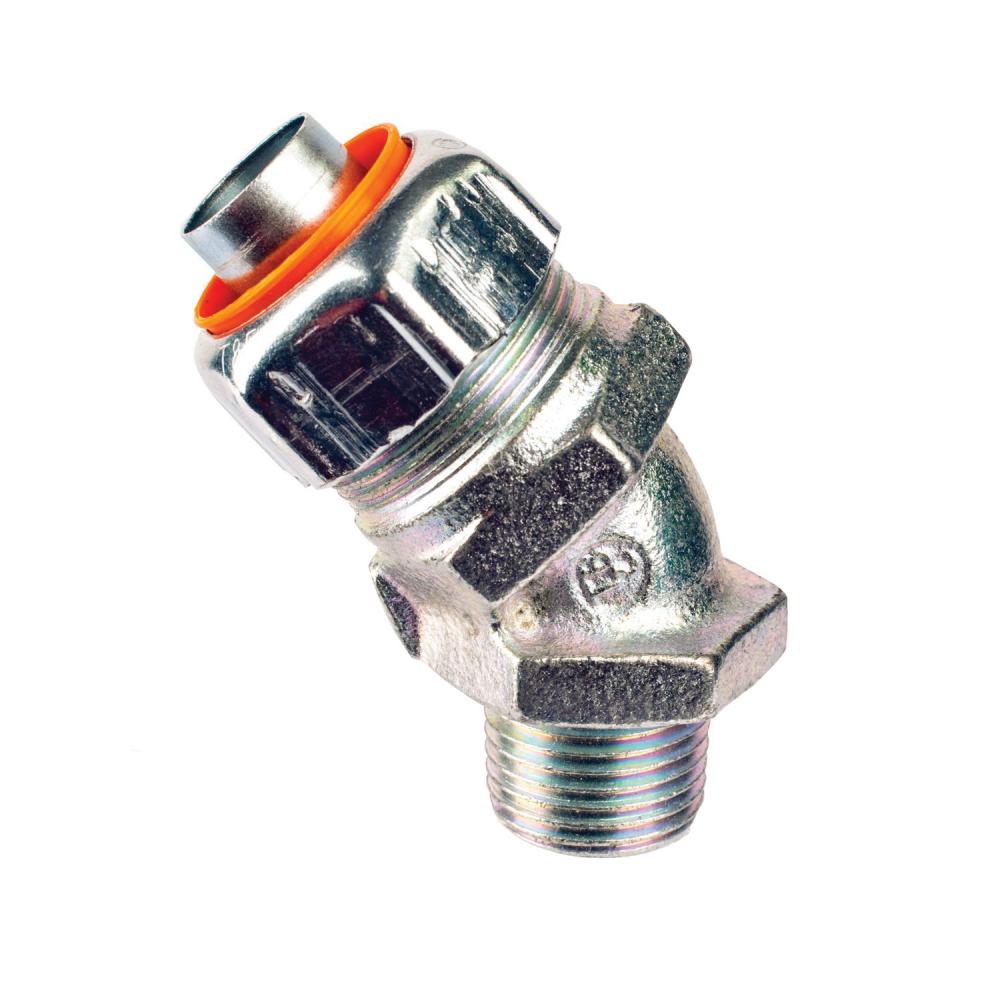 T&B® Quick-Connect™ 5241-PT Non-Insulated Push-In Liquidtight Conduit Connector, 3/8 in Trade, 1/2 in Cable Openings, 45 deg, Malleable Iron, Zinc Plated